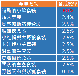 1.活動期間內罕見方塊操作合成時選擇【?】有80%機率可獲得【嶄新的小鴨】系列套裝。